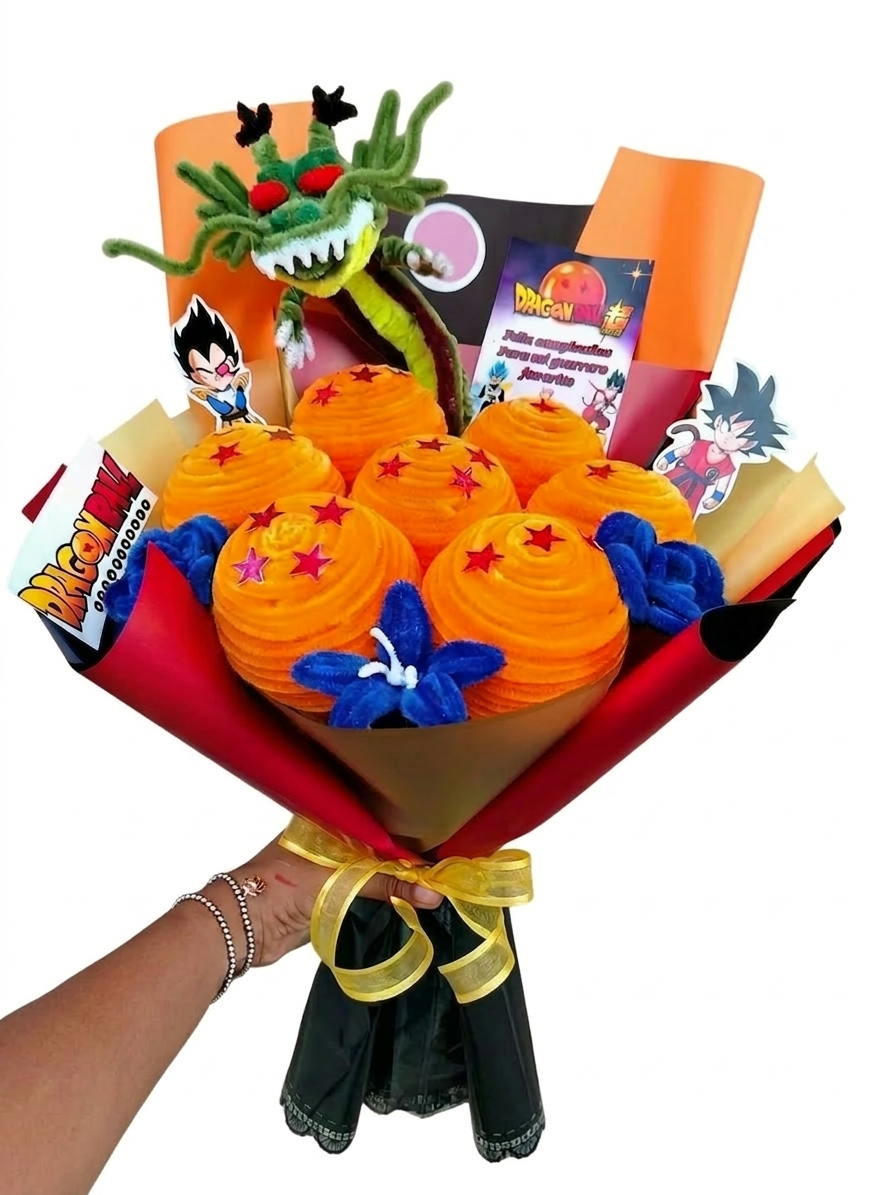 Diseño temático de Shenlong Incluye las 7 esferas del dragón Incluye 4 fores azules Colores vibrantes y personalizados Opción de agregar dulces o chocolates Figuras de Dragon Ball Mensaje personalizado incluido